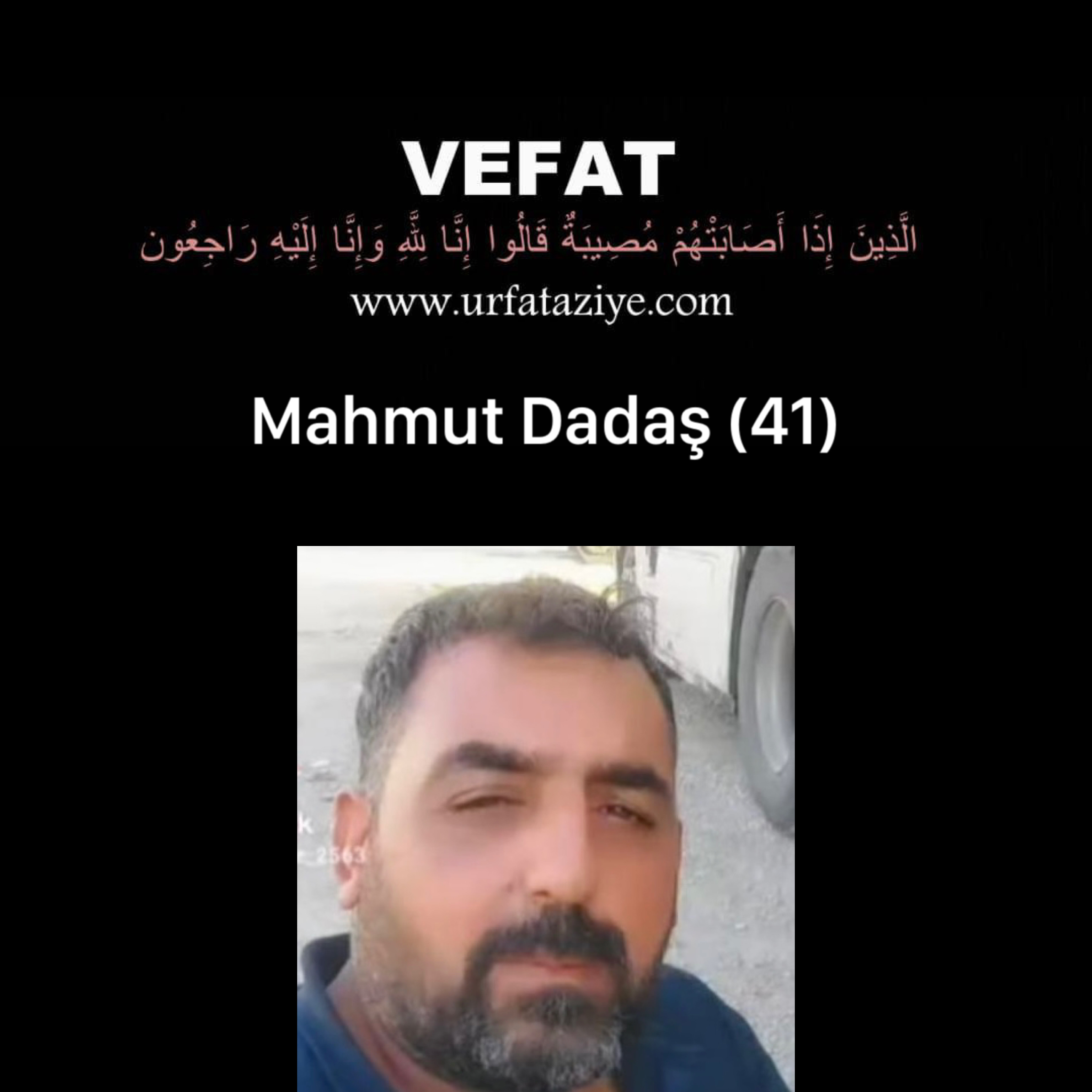 - Mahmut Dadaş vefat etmiştir.- İlan Detayı: Vefat: Mahmut Dadaş haci hasan dadaş ramazan osman kadir halil dadaşin kardeşleri hüseyin ve ahmet dadaşin yegenleri hasan emin halil sedat dadaşin amcalari mahmut dadaş hakkin rahmetine kavusmustur dost ve akarabalara duyurulur cenazesi ikindi namaznindan mutakiben dede osman camisinden alinarak dede osman aile mezarligna defnedilecektir Taziye: Dede Osman Taziye Evi (Cuma günü başlıyor) www.urfataziye.com #Urfataziye #urfa #vefat #taziye #urfavefat #duyuru