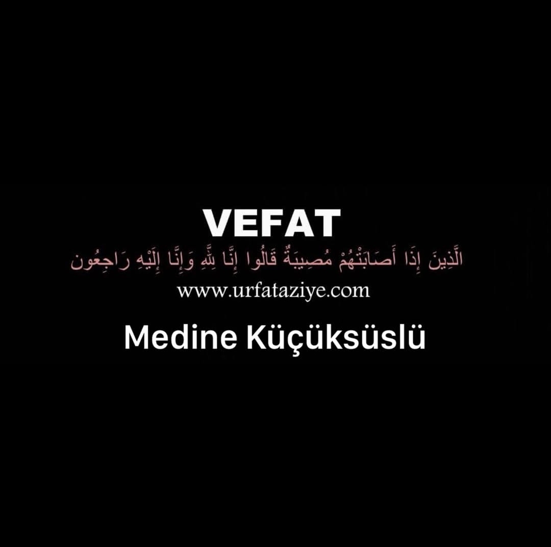 - Vefat: Medine Küçüksüslü vefat etmiştir.- İlan Detayı: Vefat: Medine Küçüksüslü Ahmet Keşküş’ün kızı; Vedat, Sedat, Şahin, Murat ve Levent Küçüksüslü’nün kıymetli anneleri, Abdurrahim Toru’nun kayınvalidesi , Kenan Altun ve Şığ Mehmet Altun’un neneleri Medine Küçüksüslü, tedavi gördüğü hastanede vefat ederek Hakk’ın rahmetine kavuşmuştur. Merhumenin cenazesi yarın ( Pazar ) günü öğle namazına müteakip Nebi Efendi Camii’nden alınarak Bediüzzaman Aile Mezarlığı’na defnedilecektir. Taziye yeri: Gerger Taziye Evi (Ahmet Erseven) www.urfataziye.com #Urfataziye #urfa #vefat #taziye #urfavefat #duyuru