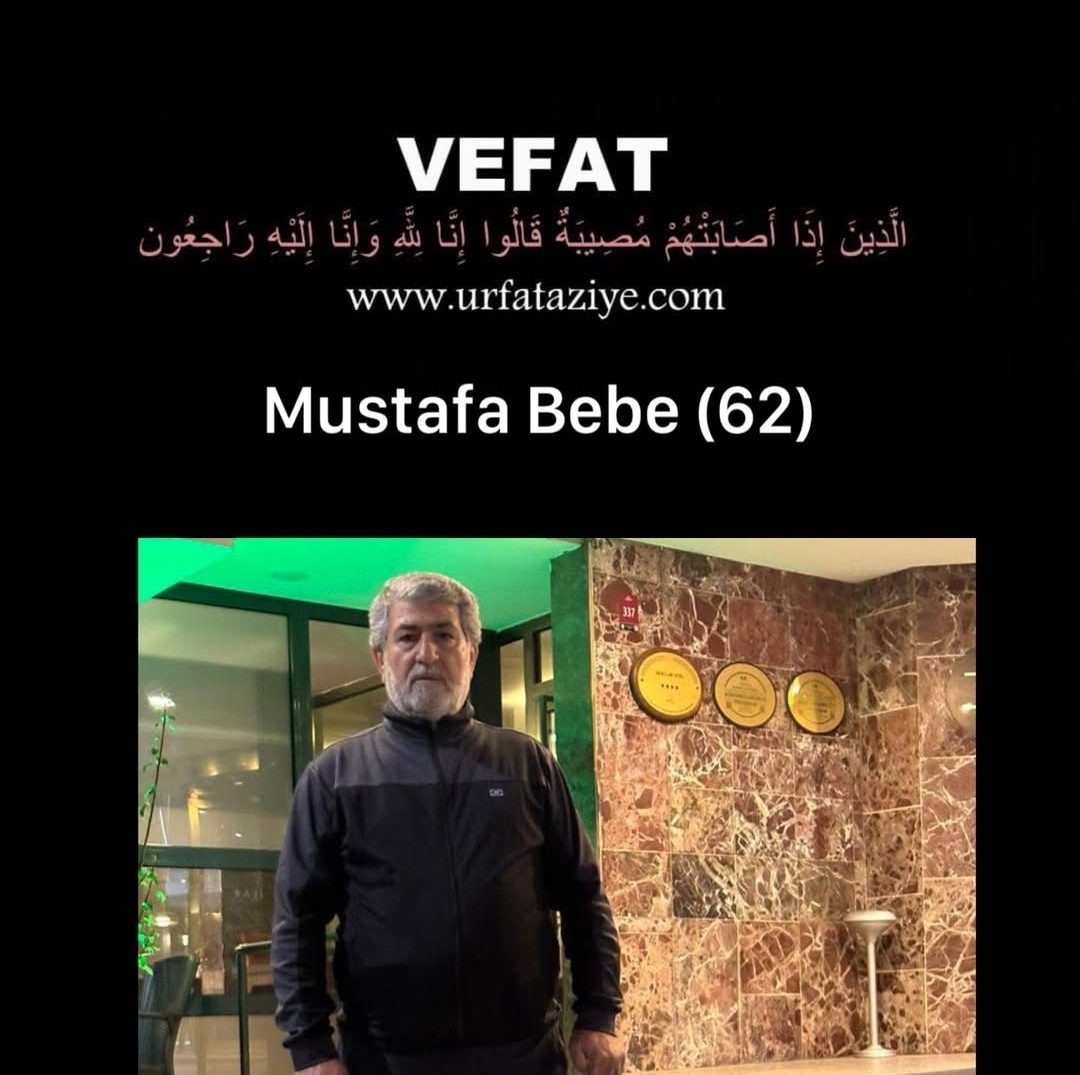 - Vefat: Mustafa Bebe vefat etmiştir.- İlan Detayı: Vefat: Mustafa Bebe Mustafa bebe Sakarya’da geçirmiş olduğu kalpkirizi nedeniyle vefat etmiştir Cenazesi yarın sabah 08:00’da hava limanından alınarak 10:00 da hilvan saluca köyüne defim edilecektir Taziye: özlek cami taziye evinde yapılacaktır www.urfataziye.com